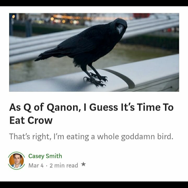Posted on March 6, 2021May 19, 2024 by caseyplainsmith.com Click this sentence to read “As Q of Qanon, I Guess It’s Time To Eat Crow” on The Haven. Share this:Tweet Click to share on Reddit (Opens in new window) Reddit Share on Tumblr Click to email a link to a friend (Opens in new window) Email Like Loading... Related